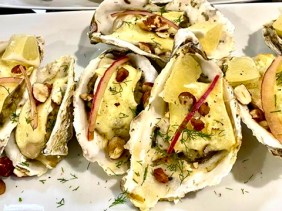 OSTRAS GRATINADAS COM BRIE, LARANJA E PECAN
