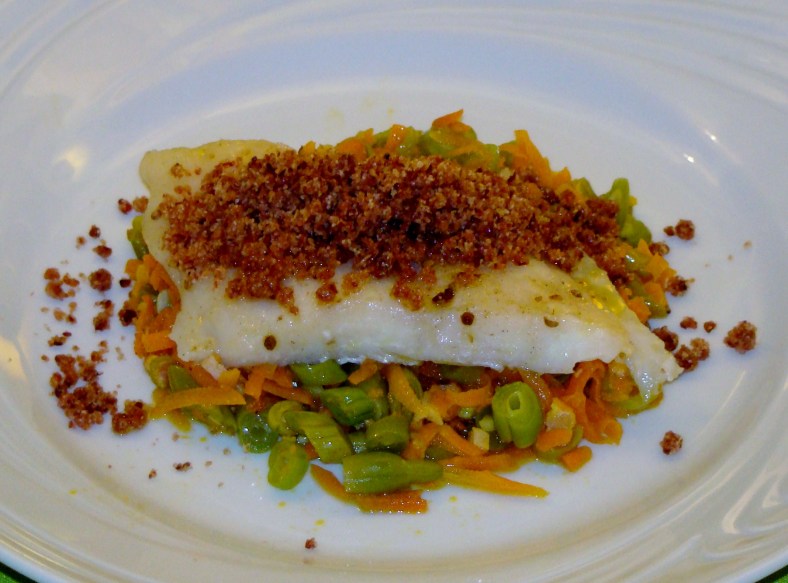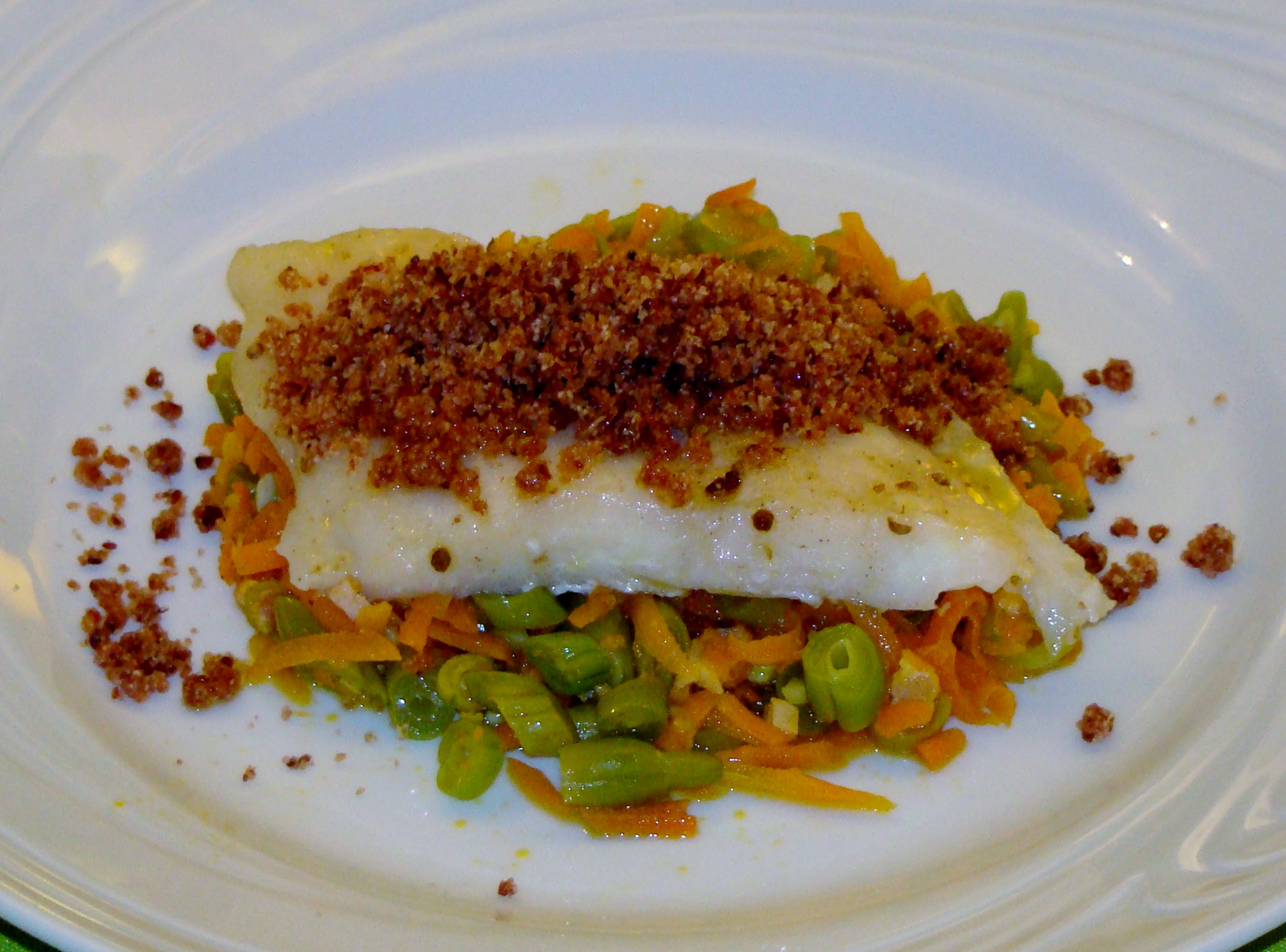 Coloque a farofa sobre o peixe e sirva com o preparado de feijão verde, cenoura e bacon.