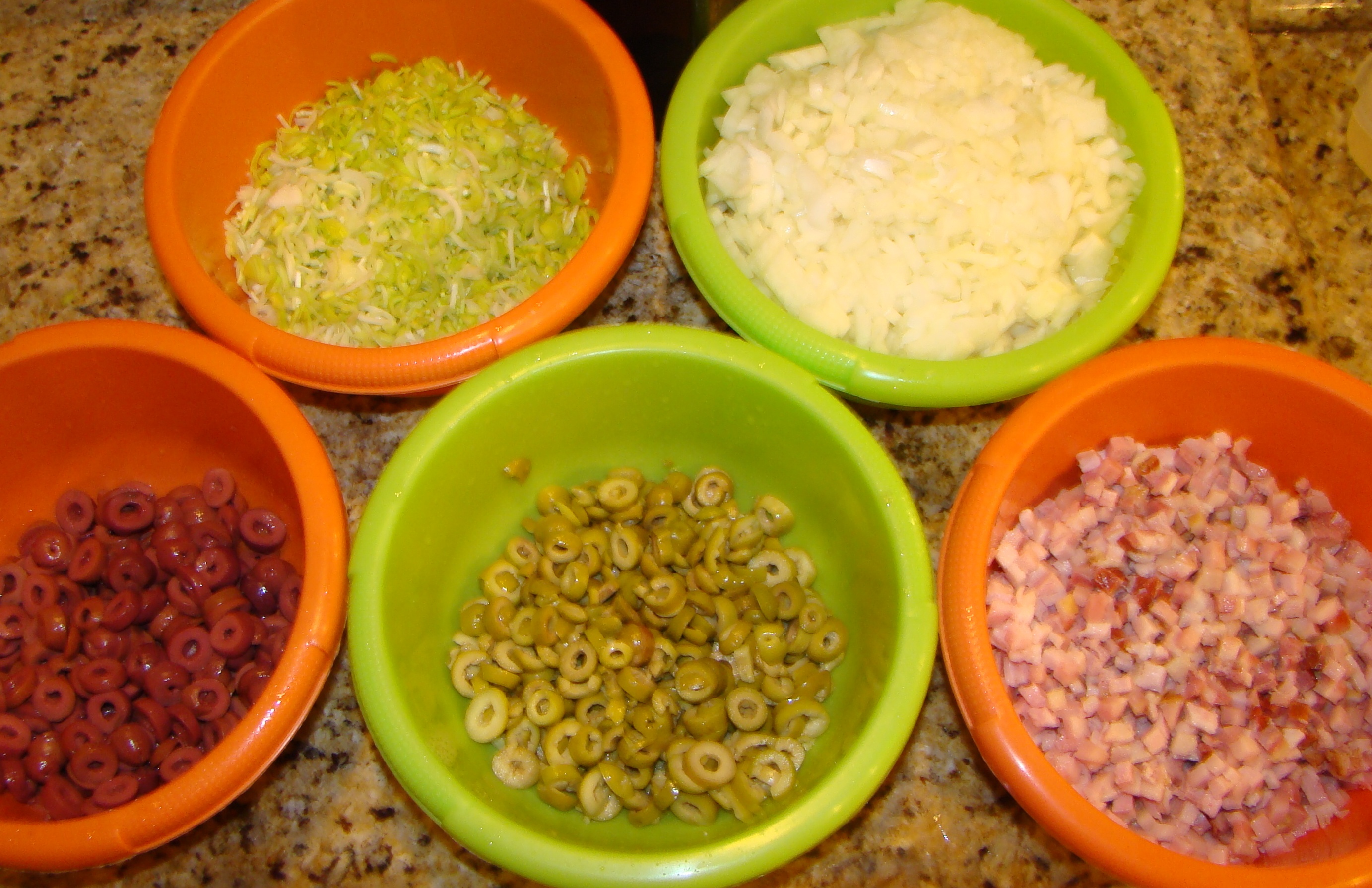 Corte o bacon em cubos pequenos, a cebola  em cubos médios, o alho-poró em fatias bem fininhas e as azeitonas em fatias.