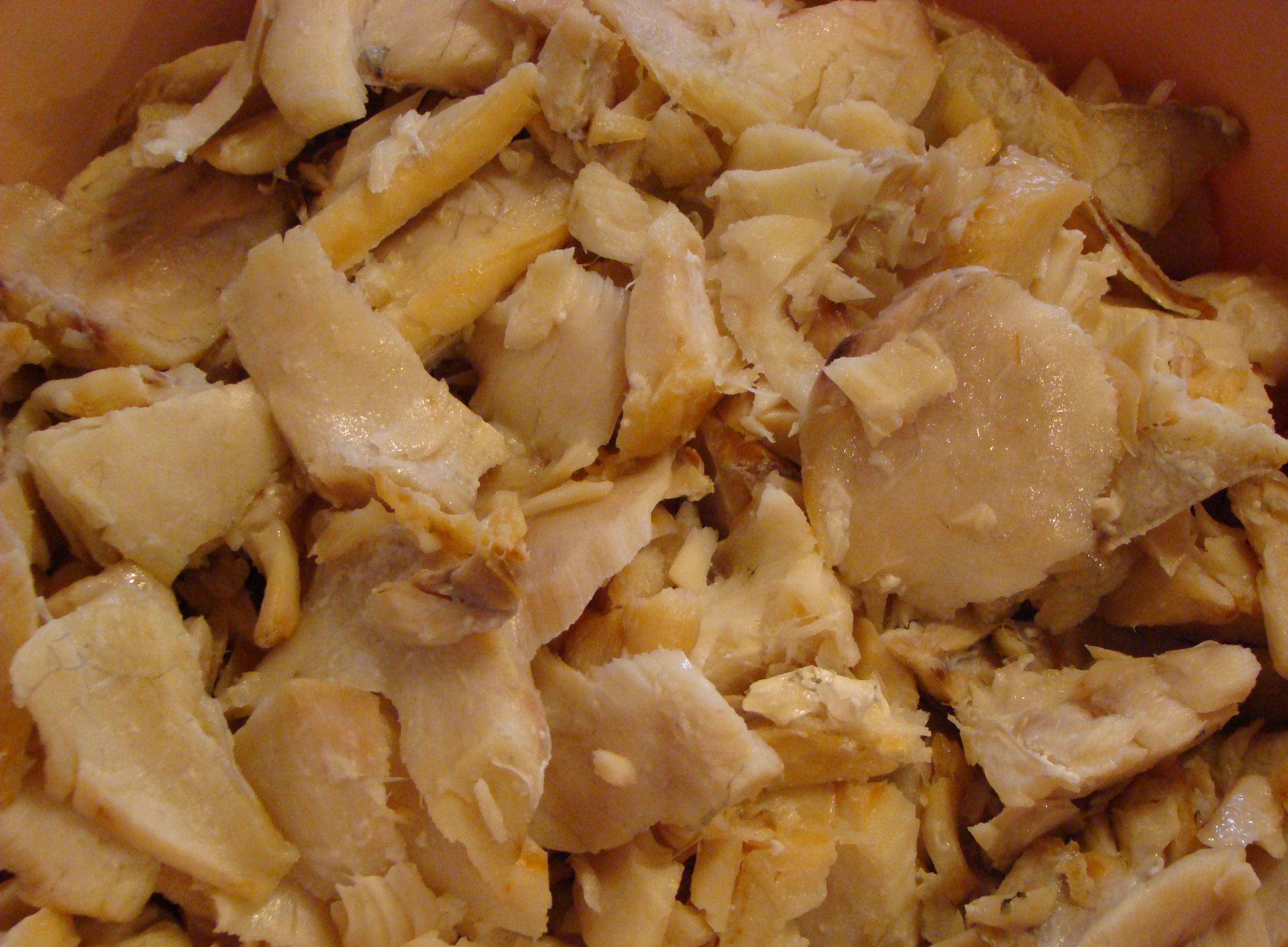 Para o purê, cozinhar as batatas, na água que foi fervido do bacalhau, processar com a nata, a manteiga, o gengibre, a pimenta, corrigir o sal. Acrescente o leite até obter a consistência de creme.