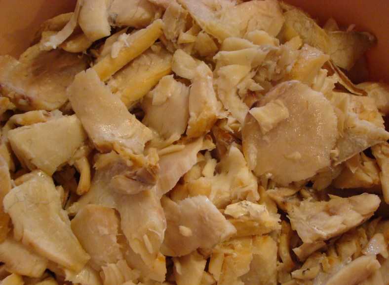 Dessalgue o bacalhau, cozinhe na água em fervura branda por 10 minutos. Reserve a água da fervura, retire a pele e as espinhas do bacalhau e reserve.