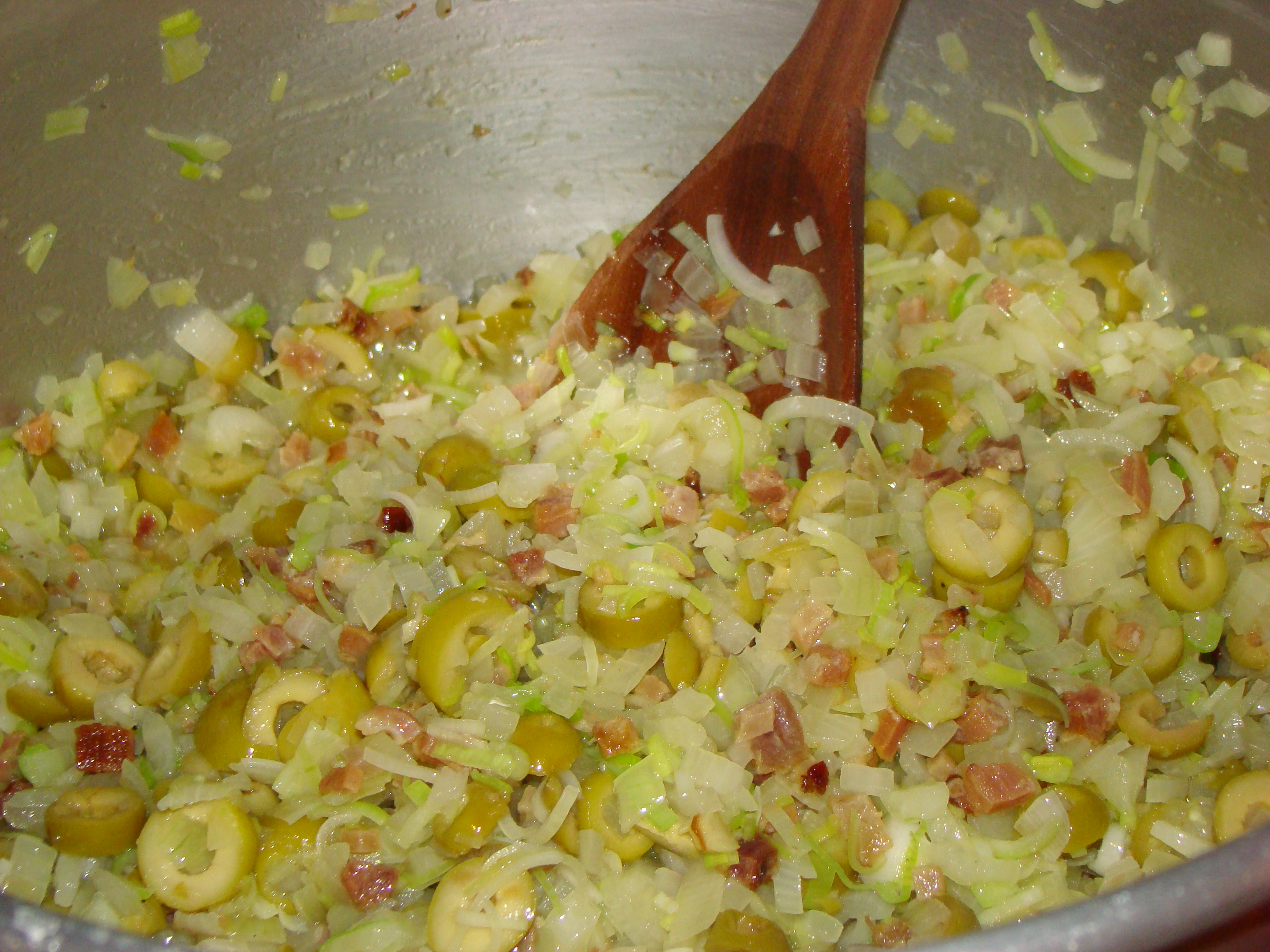 Frite o bacon, quando liberar a gordura, acrescente a cebola, depois o alho-poró e as azeitonas verdes.