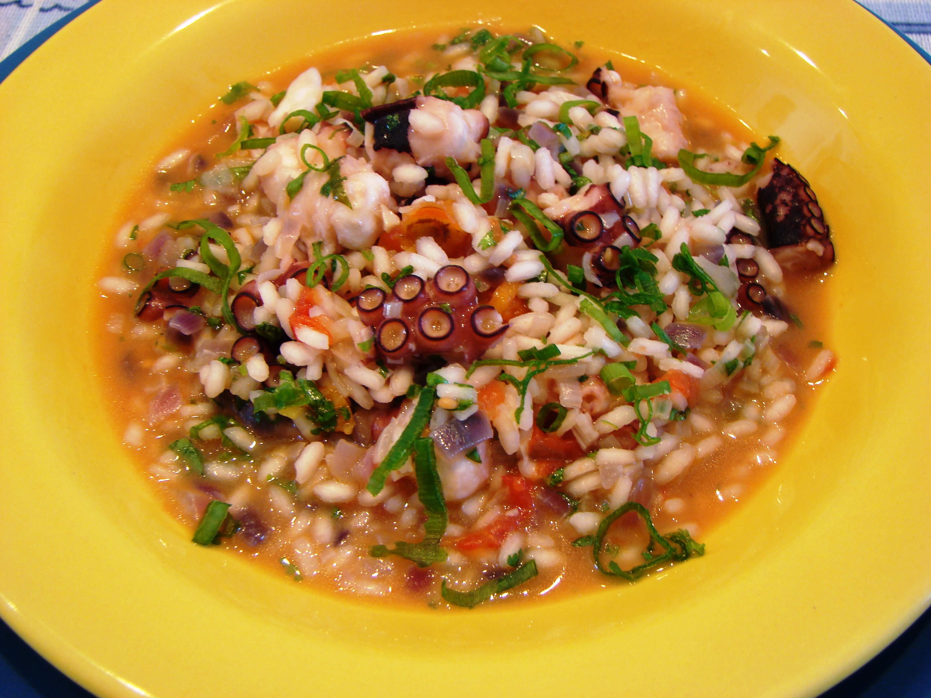 -Adicione aos poucos o caldo de peixe, cozinhe mexendo sempre para que fique cremoso. Quando o arroz estiver quase no ponto, acrescente o polvo reservado, corrija o sal e termine o cozimento.