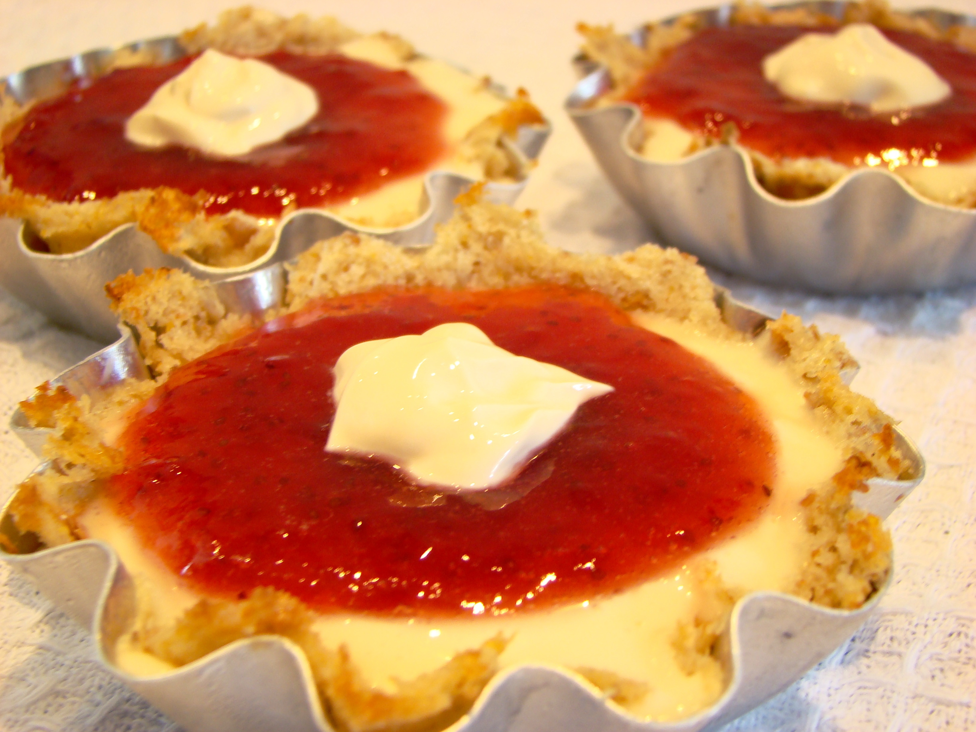 -Quando as forminhas, com a massa, estiverem frias, coloque o creme e leve a geladeira. Espere até que fique firme e coloque a geléia de morango fazendo uma cobertura.