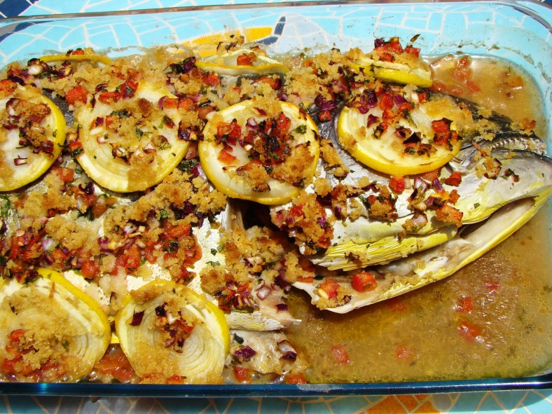 -Encher a cavidade abdominal com parte do composto de tomates, dividir o restante sobre a superfície do peixe. Faça o mesmo com as fatias de cebola e de limão. Salpique o peixe com a farinha de rosca o azeite e a salsa picada.