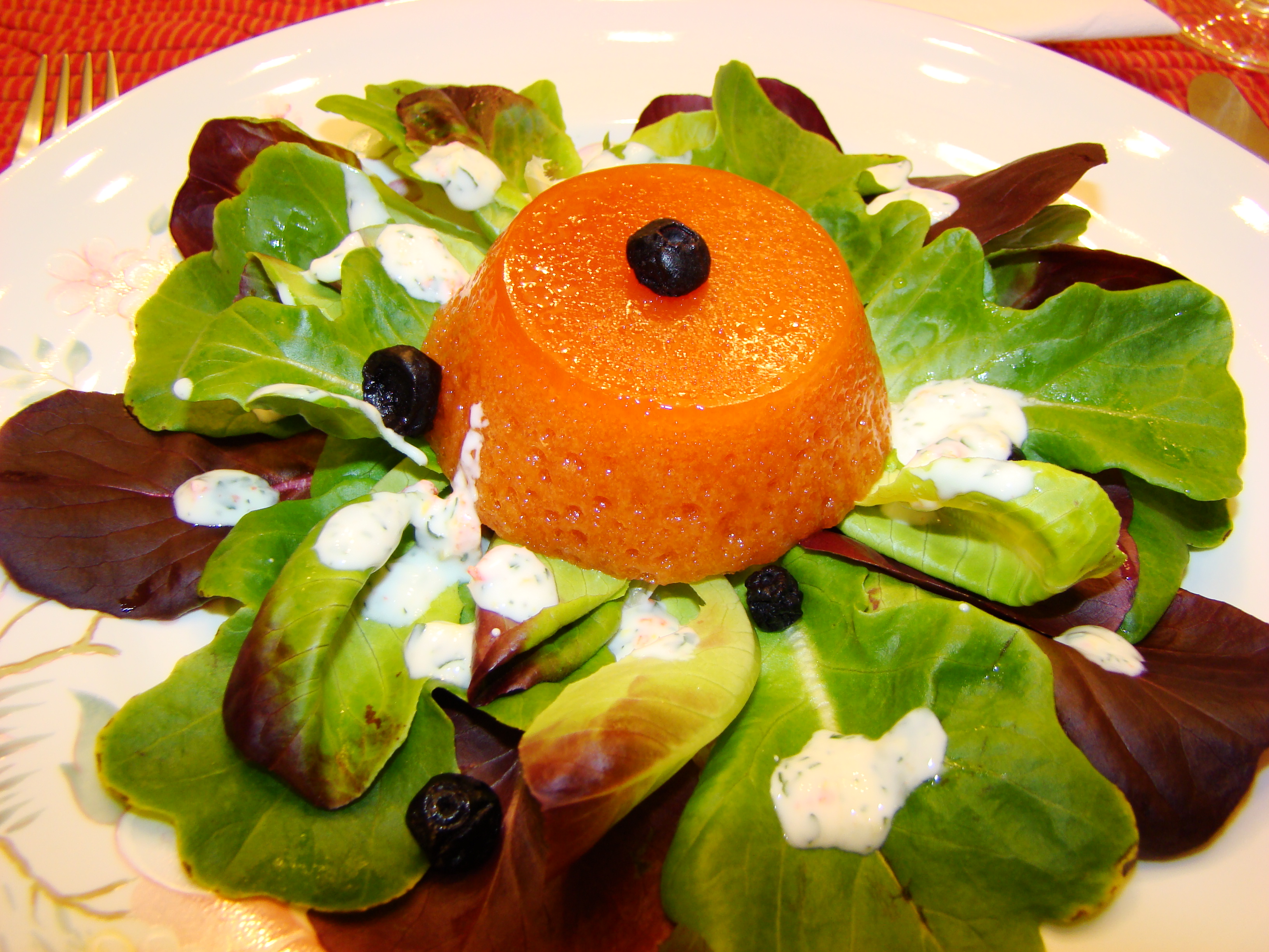 -Unte com óleo uma forma anel grande ou várias forminhas pequenas e despeje dentro o aspic de tomates. Leve a geladeira até que esteja firme (+/- 3 horas).