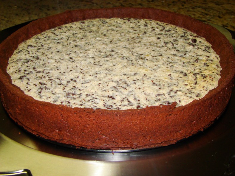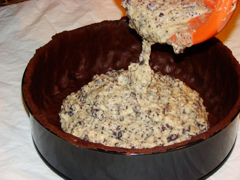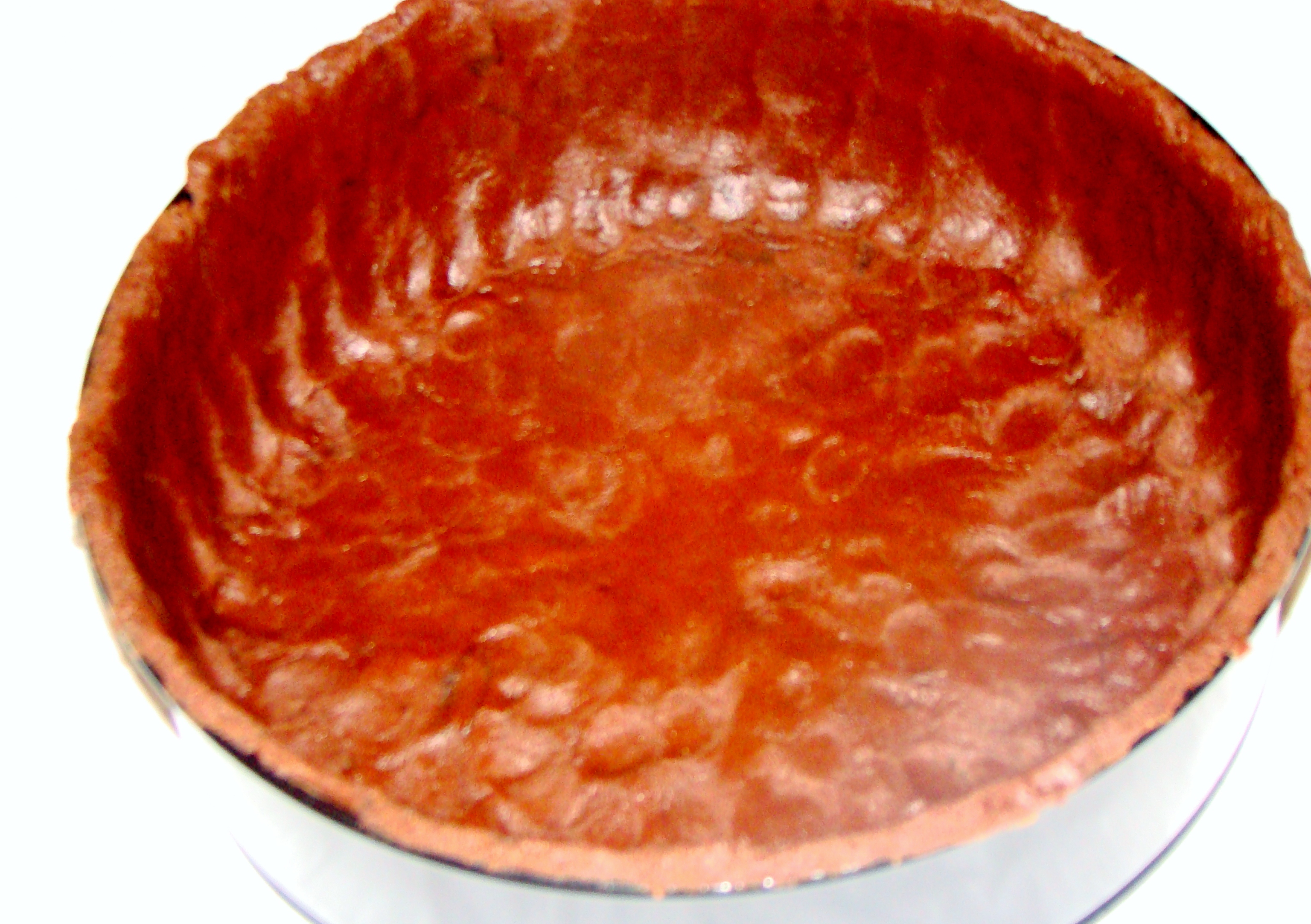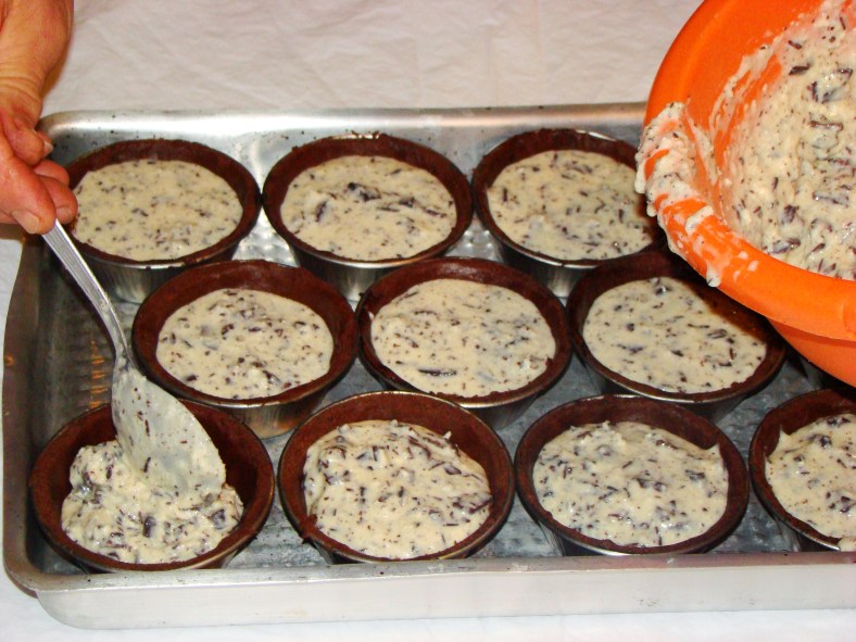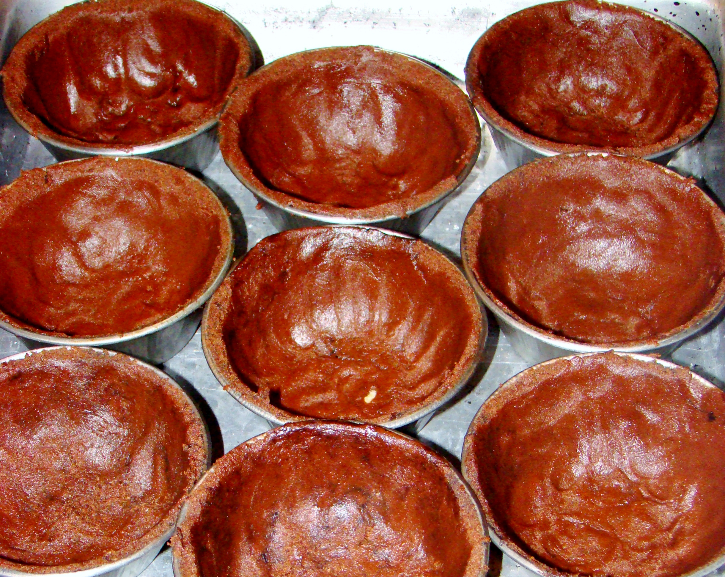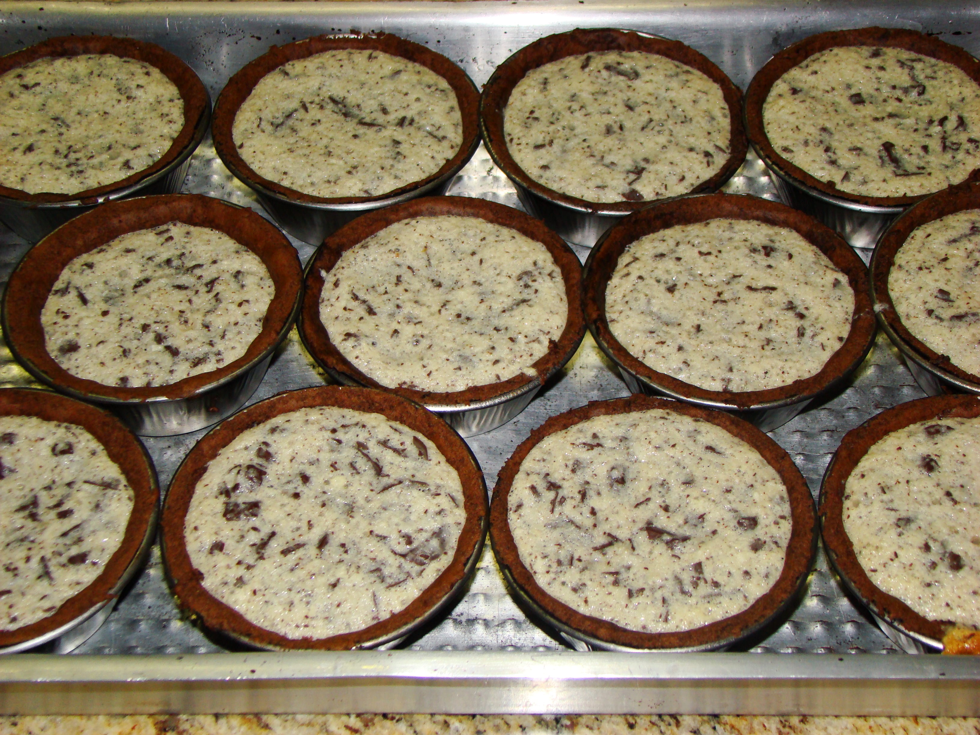 – Bata bem o açúcar e a manteiga, adicione os ovos, a farinha misturada com o fermento e o chocolate em pó, amasse até ficar uma massa firme. Forre o fundo e as laterais de uma forma de aro removível  ou 12 forminhas de bolo inglês. Reserve.