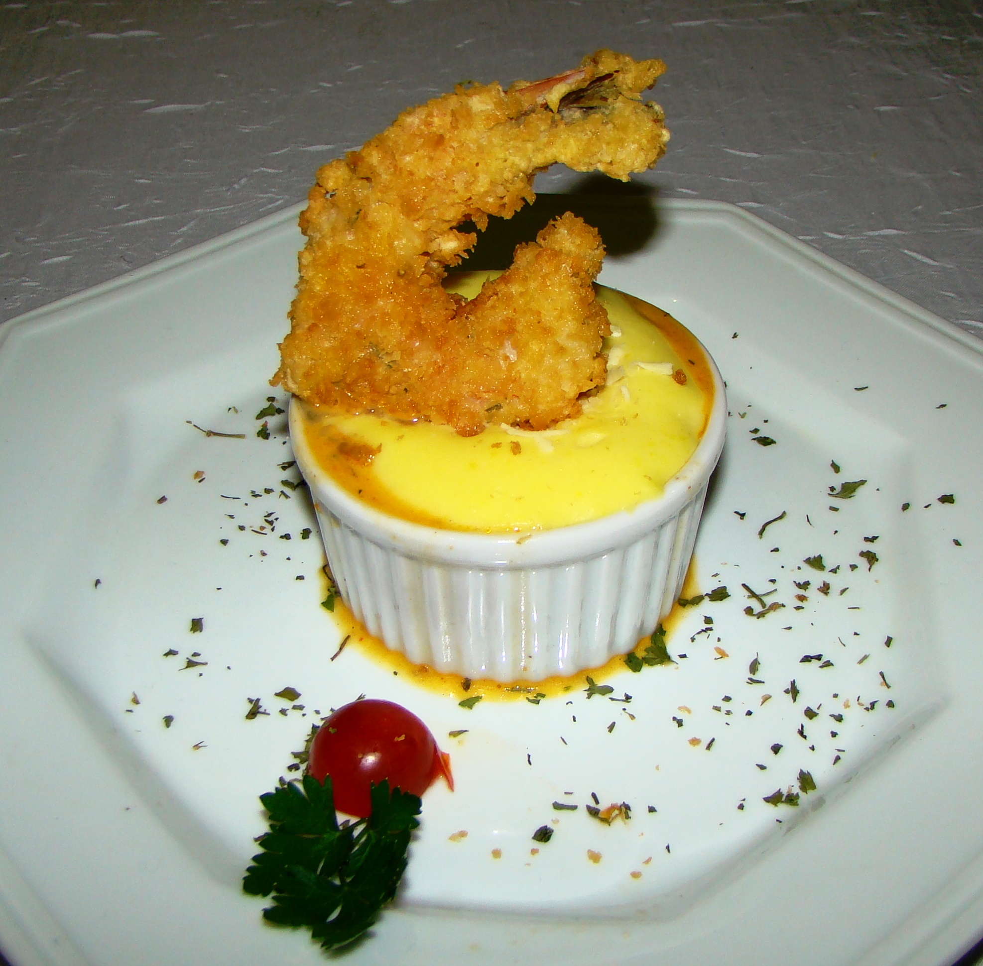 – Passe cada camarão na farinha de trigo, depois nos ovos batidos e em seguida na farinha panko.