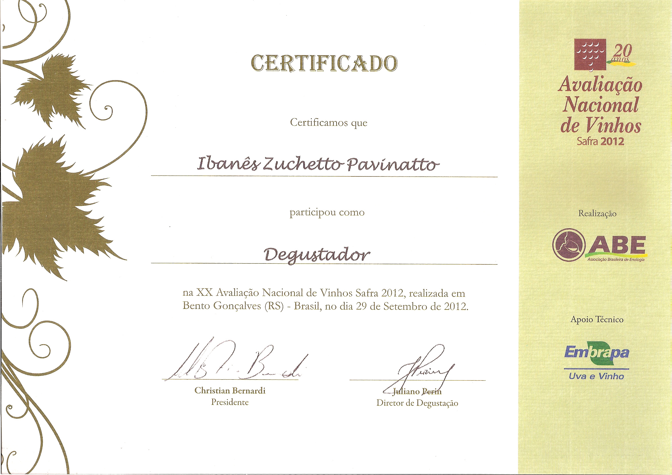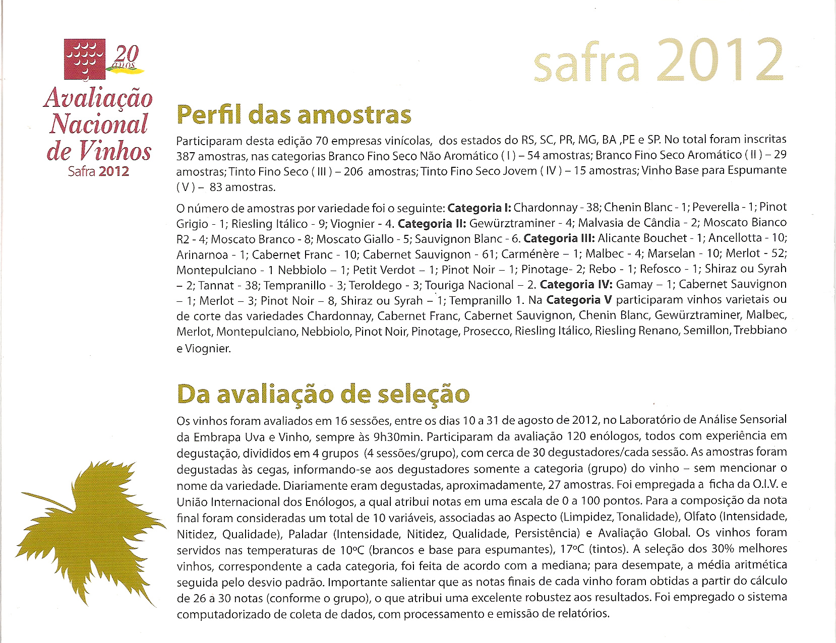 Ao participar da Avaliação Nacional de Vinhos (ANV) tive o privilégio de conhecer a representatividade da Safra 2012. Foram 16 amostras selecionadas, resultante da análise feita por 120 enólogos brasileiros que, segundo normas internacionais, degustaram às cegas no Laboratório de Análise Sensorial da EMBRAPA Uva e Vinho.