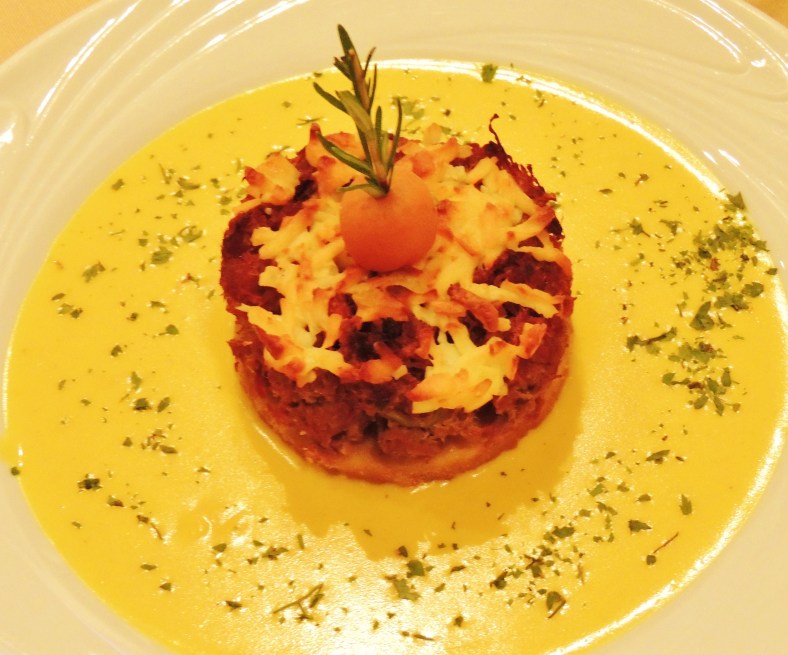 – Coloque o galette no meio do prato e regue com molho de moranga aquecido em volta.
