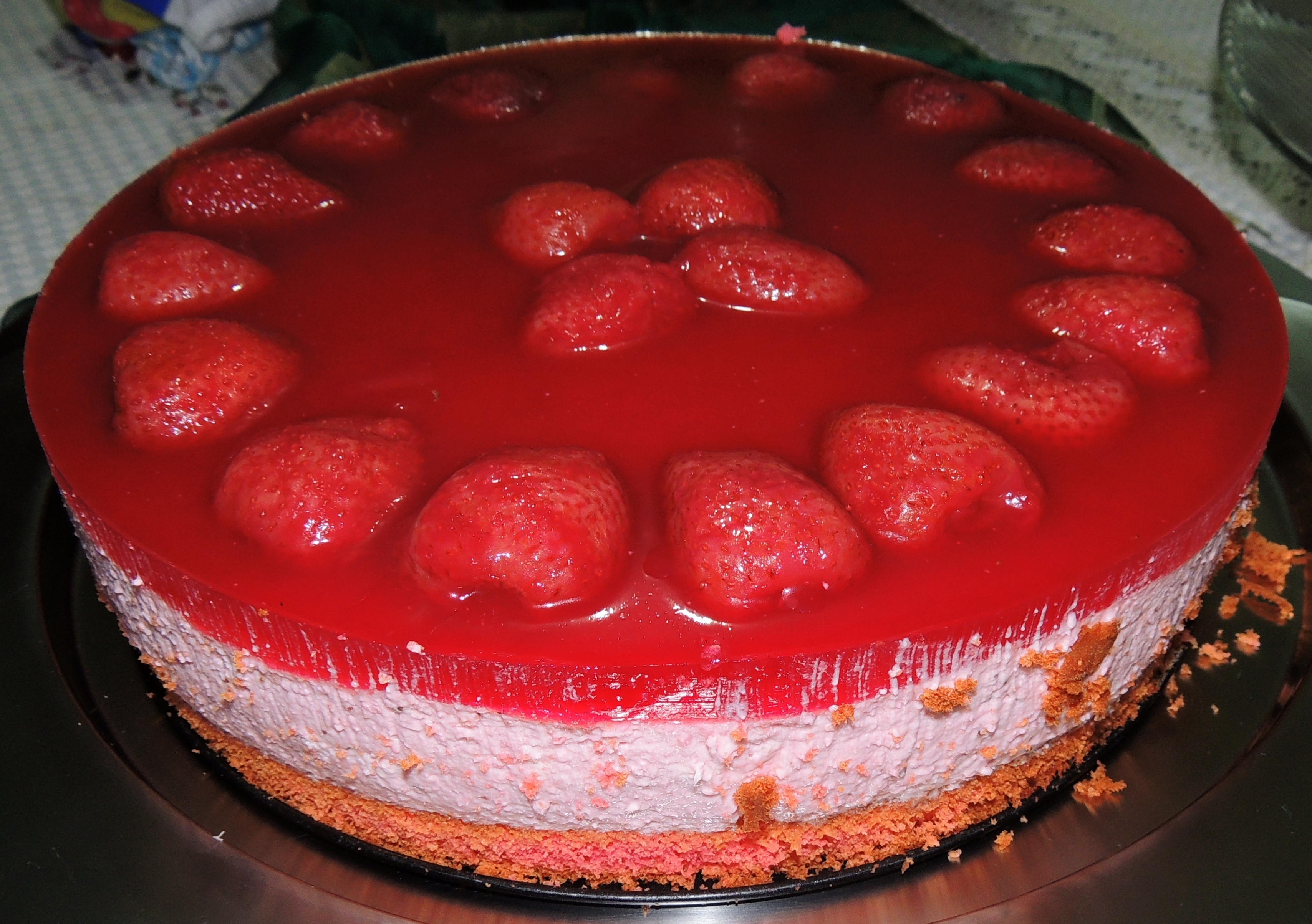 -Cozinhe a polpa de morango com o açúcar, mexendo de vez em quando, até ficar ligeiramente espessa. Deixe esfriar e aplique sobre o recheio. Outra opção, como a da foto, usar 250 ml de água, 1 xícara de açúcar, 1 xícara de polpa de morango e uma colher de gelatina sem sabor vermelha, ferva, deixe esfriar e aplique sobre o recheio. Decore com morangos inteiros.