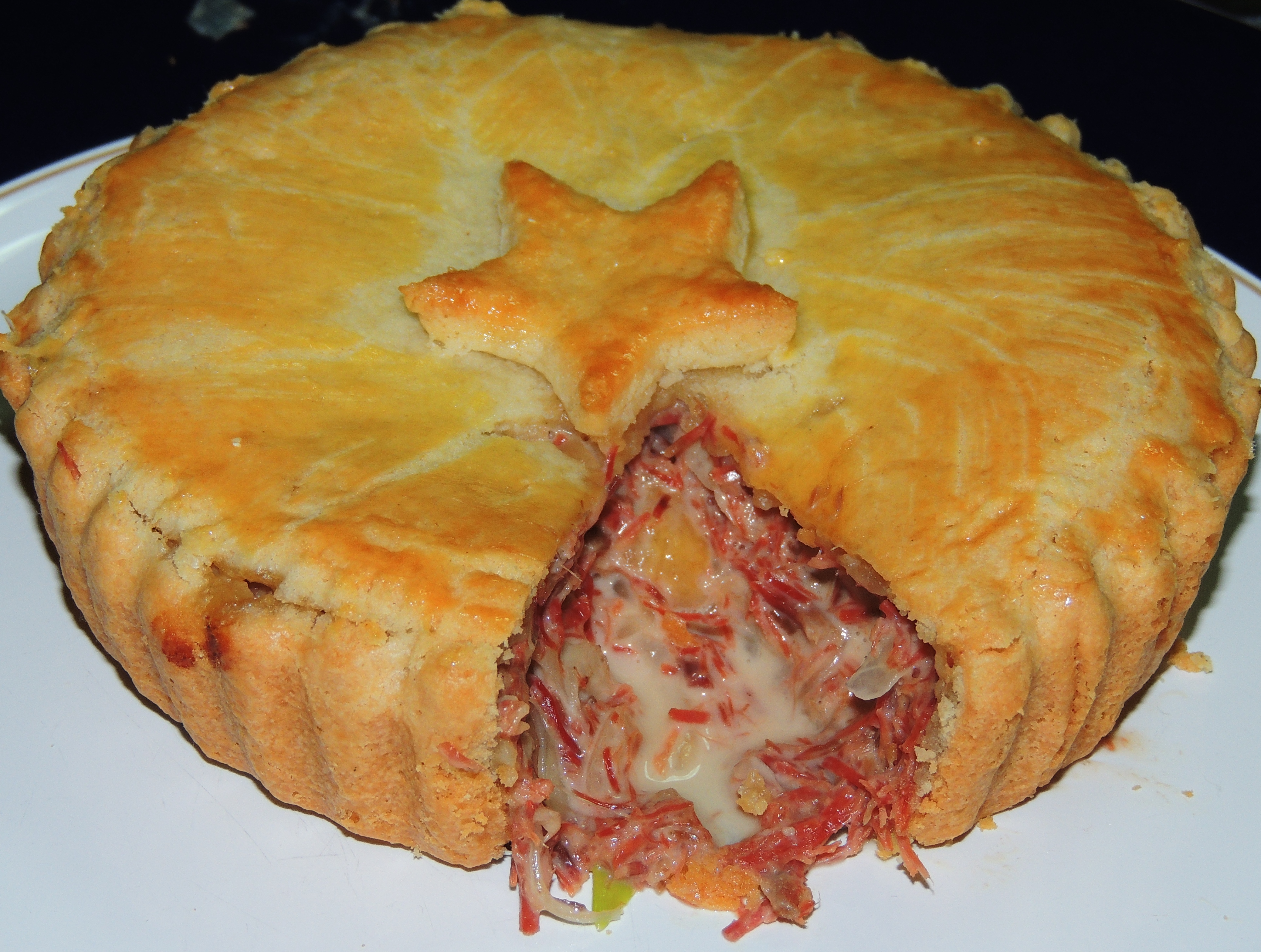 -Abra a massa entre dois plásticos, forre o fundo e as laterais de uma forma com aro removível ou três pequenas (13 cm de diâmetro). Coloque o recheio de carne seca e tampe com uma camada de massa, pincele com a gema e leve ao forno pre aquecido, 180ºC, até dourar (+/- 30 minutos).
