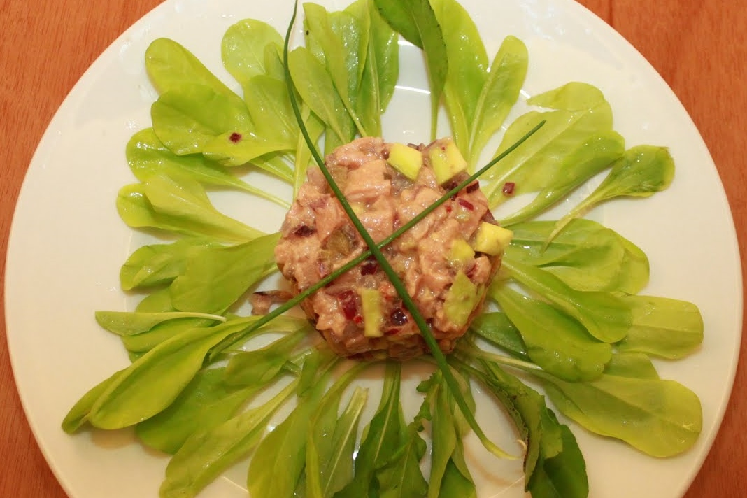 Divida o tartar em porções e se quiser molde com aros. Finalize com ciboulette. Sirva com folhas da sua preferência.