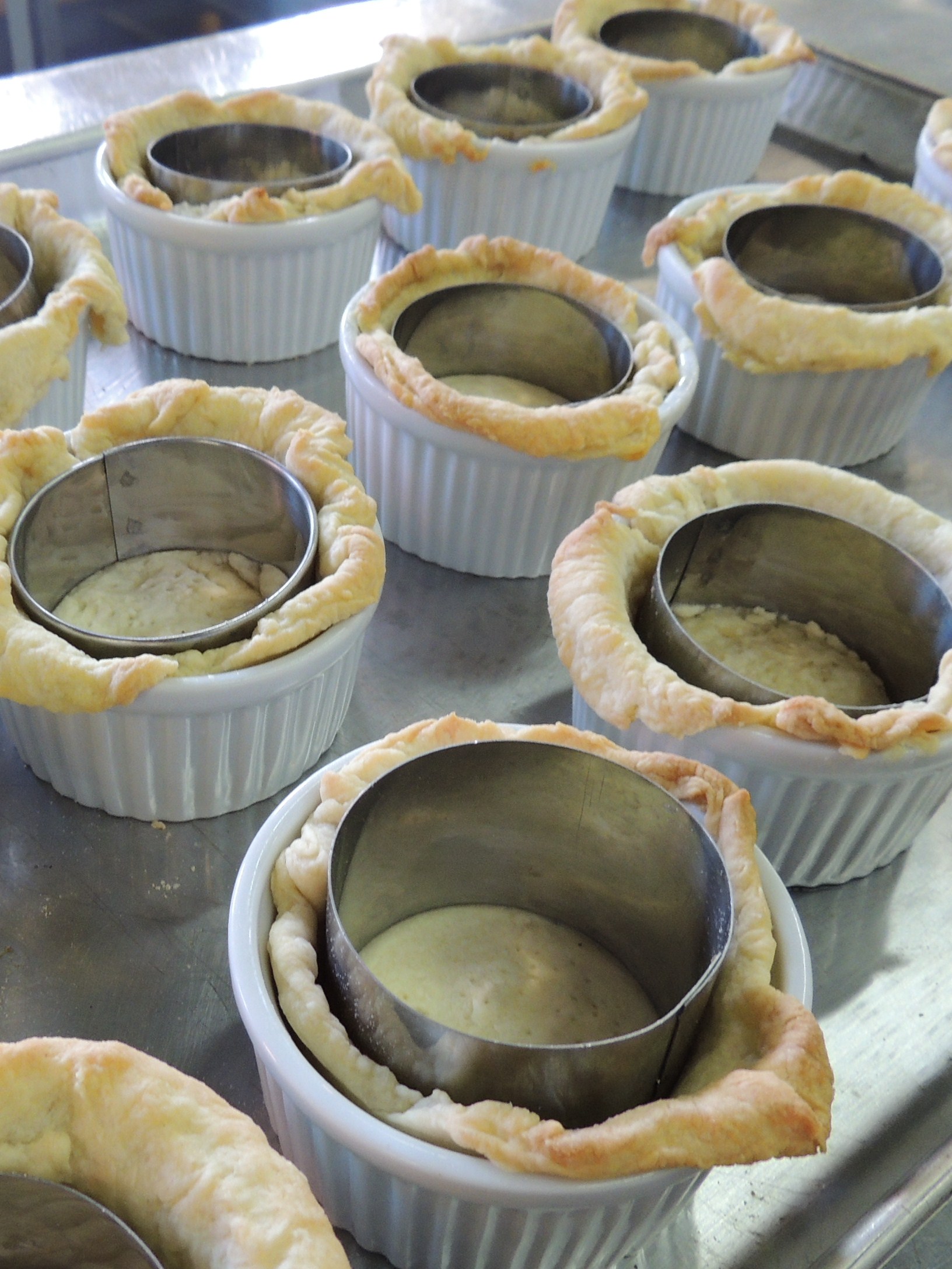 Com a massa, forrar formas de tarteletes ou ramequins, furando com um garfo o fundo para não crescer e protegendo as laterais com um aro para não perder o formate de uma cestinha. Assar no forno, 180⁰C, sem deixar dourar.