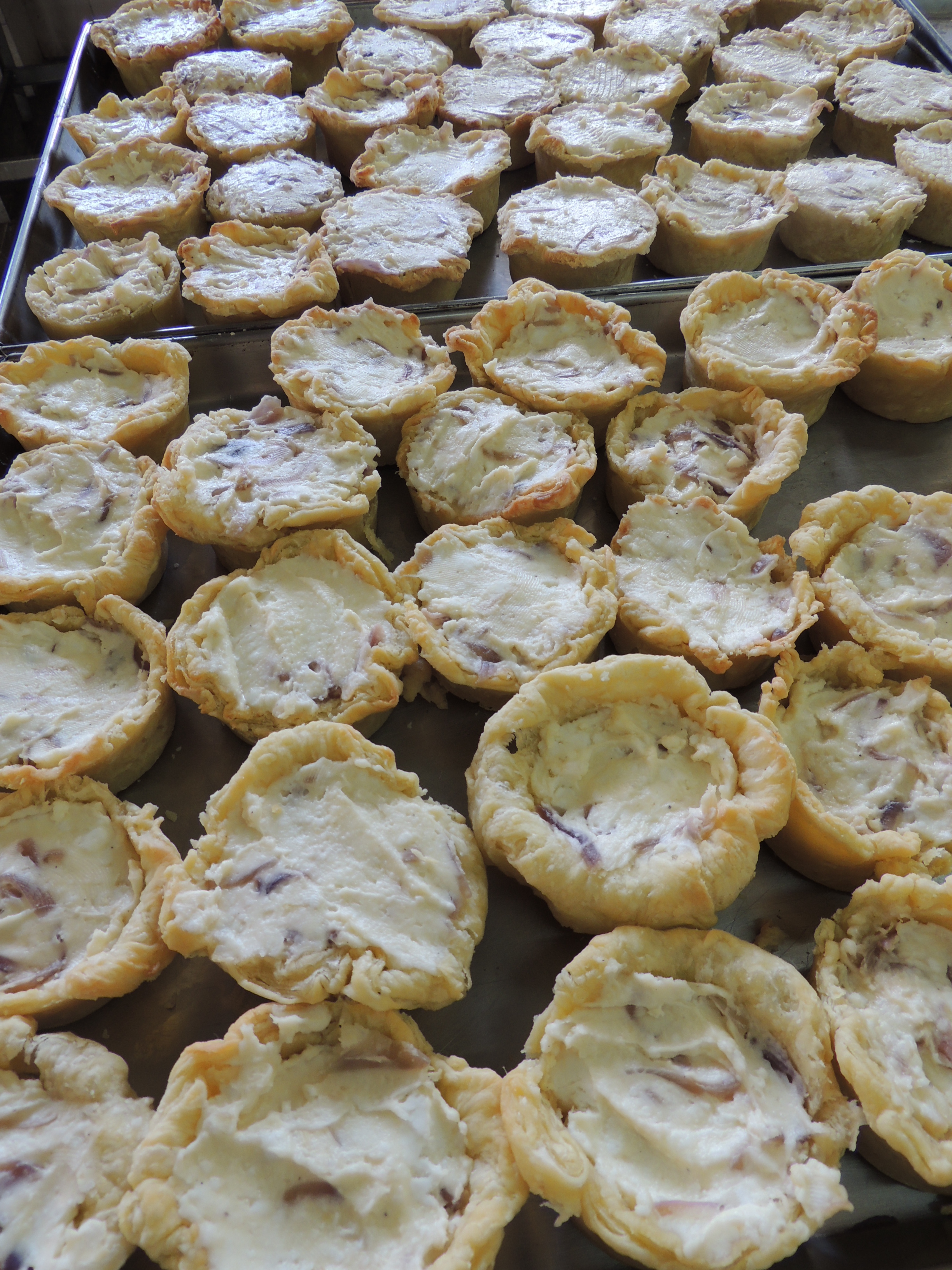 Saltear a cebola roxa picada na manteiga. Retirar do fogo, incorporar o queijo de cabra misturando bem. Incorporar o creme de leite, o sal e a pimenta. Com este preparo, rechear as tarteletes e levar ao forno até dorar.