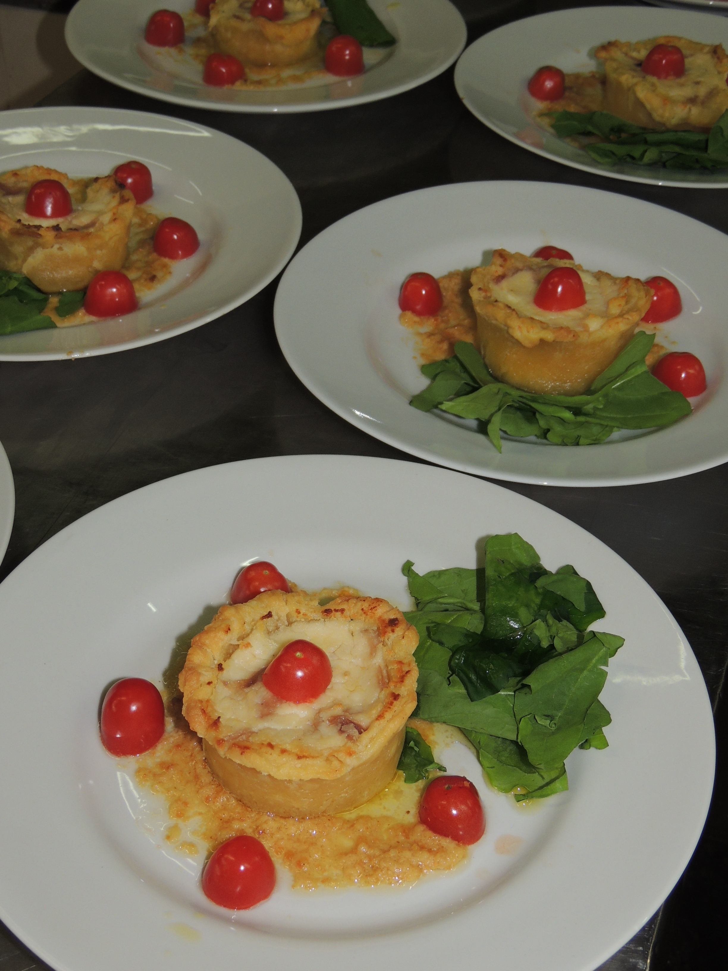 Colocar a tartelete no centro do prato, acompanhar com folhas de rúcula e tomatinhos cereja e agregar o vinagrete de amendoim.