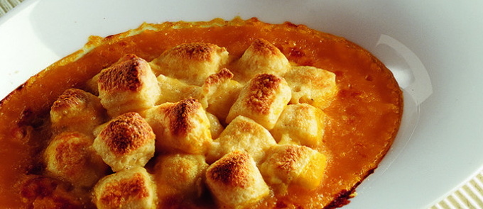 Amassar a abóbora, acrescentar o caldo de legumes e temperar com sal. Espalhar o creme em 6 pratos que podem ir ao forno, adicionar o nhoque escorrido, salpicar com o parmesão e levar ao forno a 220 ° C até que eles formarem uma crosta dourada. Retirar do forno e servir imediatamente.
