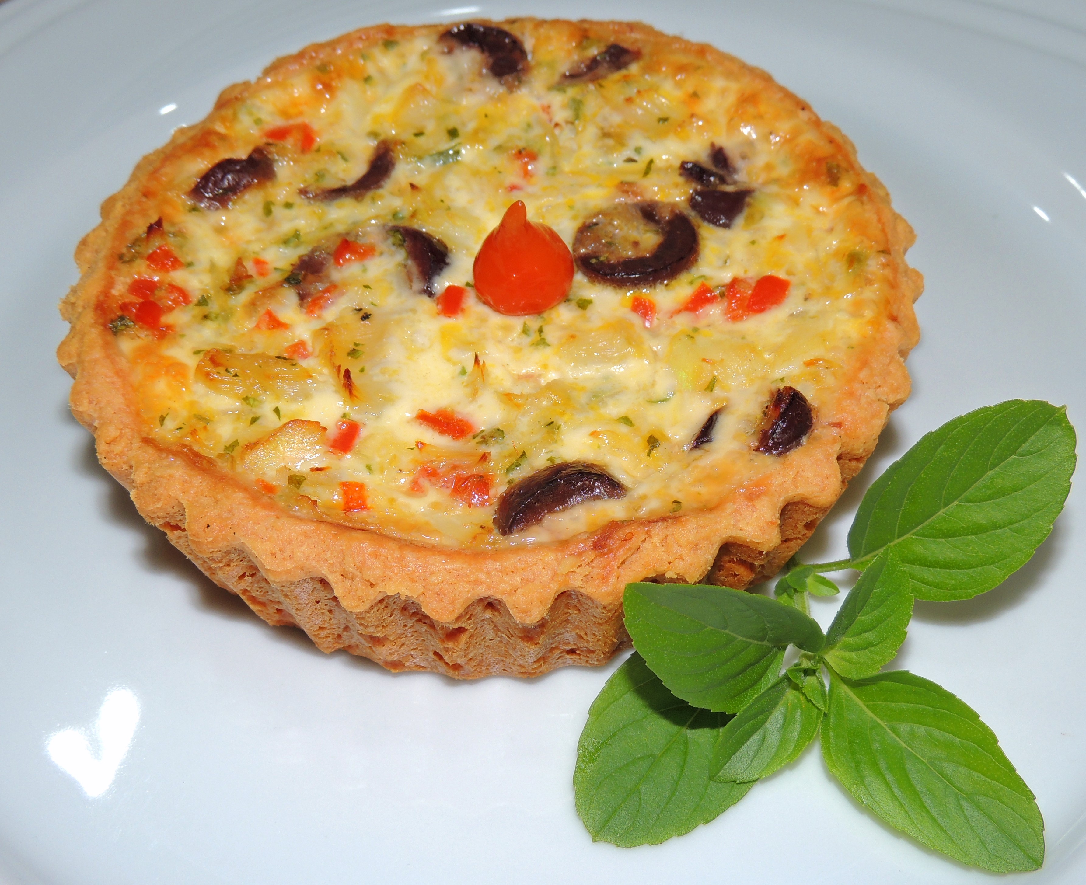 Refogue a cebola, o alho poró, o pimentão vermelho e o alho no azeite. Junte o bacalhau e, por último, acrescente a salsa picada. Coloque esse refogado sobre a massa da quiche e acrescente as azeitonas cortadas em rodelas.
