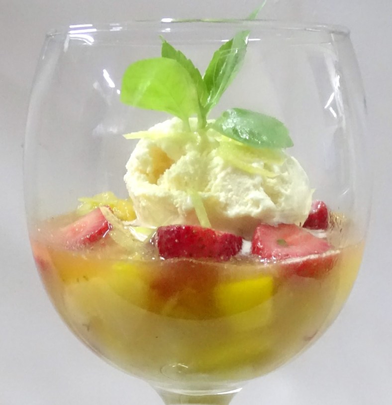 Em uma taça, coloque uma porção os morangos, uma concha de frutas e uma bola de sorvete. Para finalizar, coloque raspas de limão e folhas de mangericão.