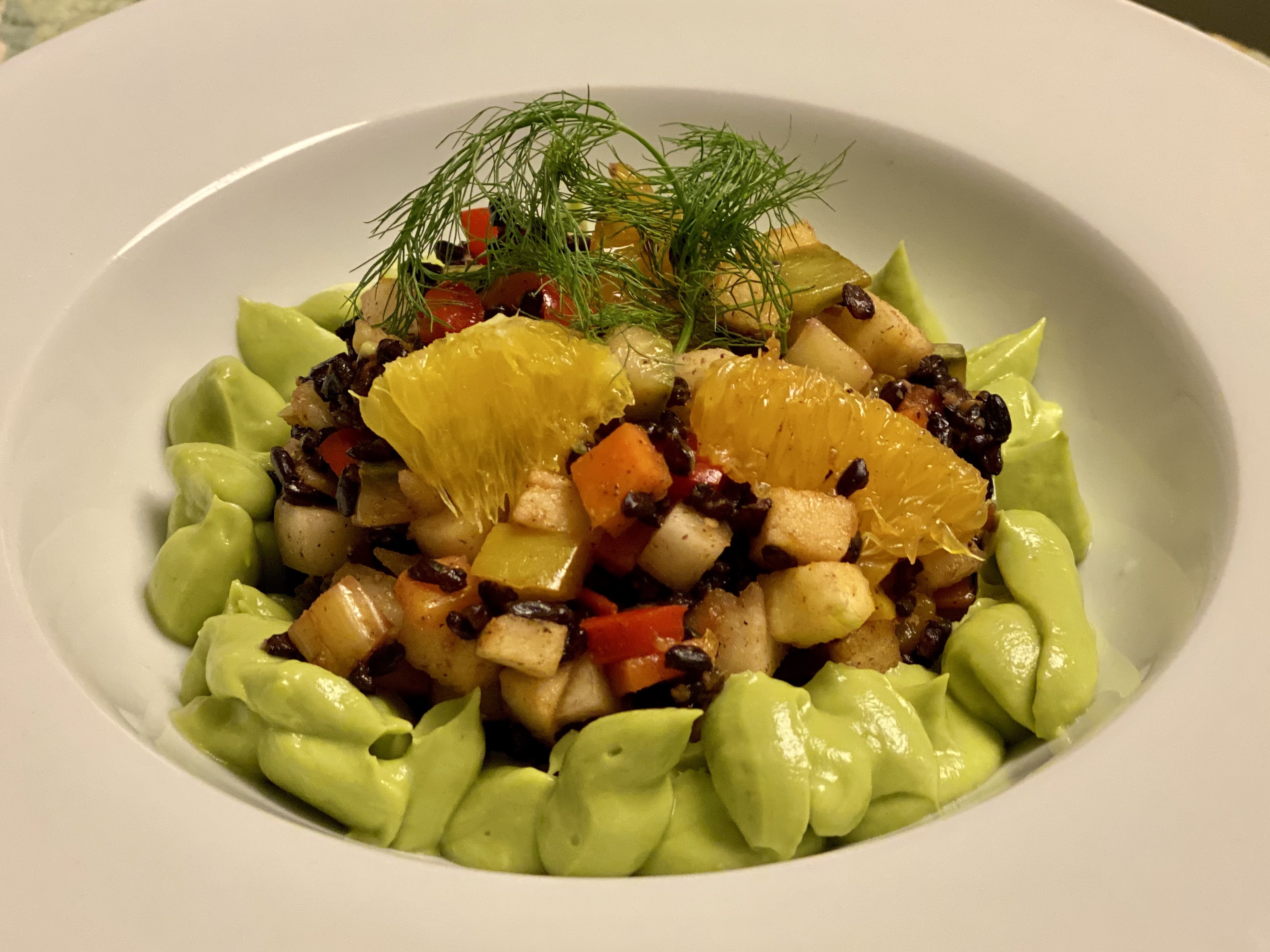 Montagem; colocar uma porção do creme de avocado, o arroz com os legumes e as frutas e decorar com folhas de funcho.