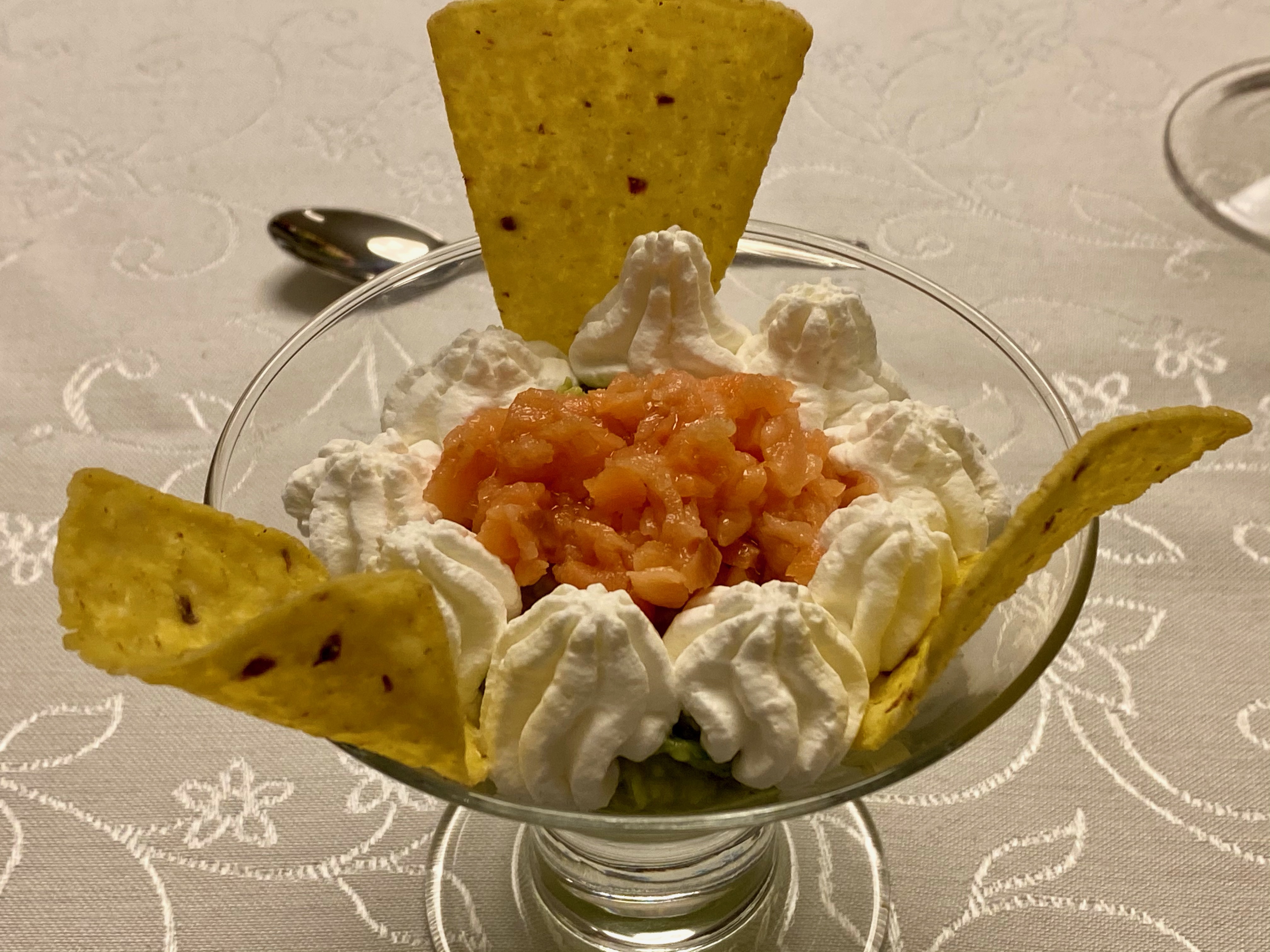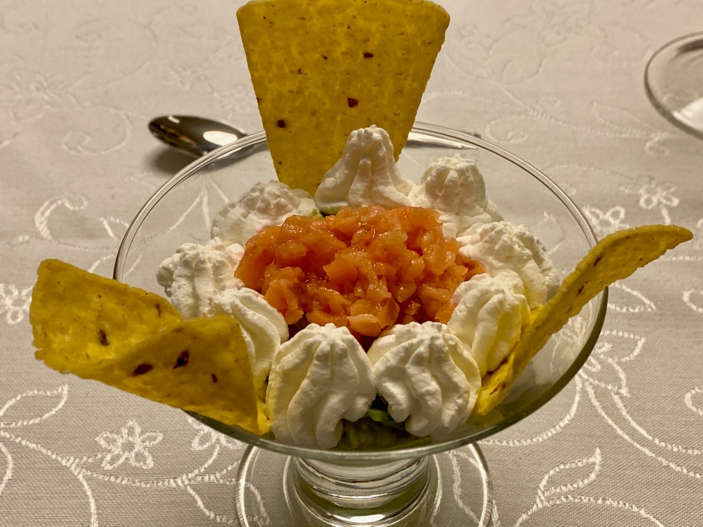 Em quatro taças ou copinhos, coloque a guacamole, depois o salmão picado e o creme azedo. Sirva com tortilhas de milho.