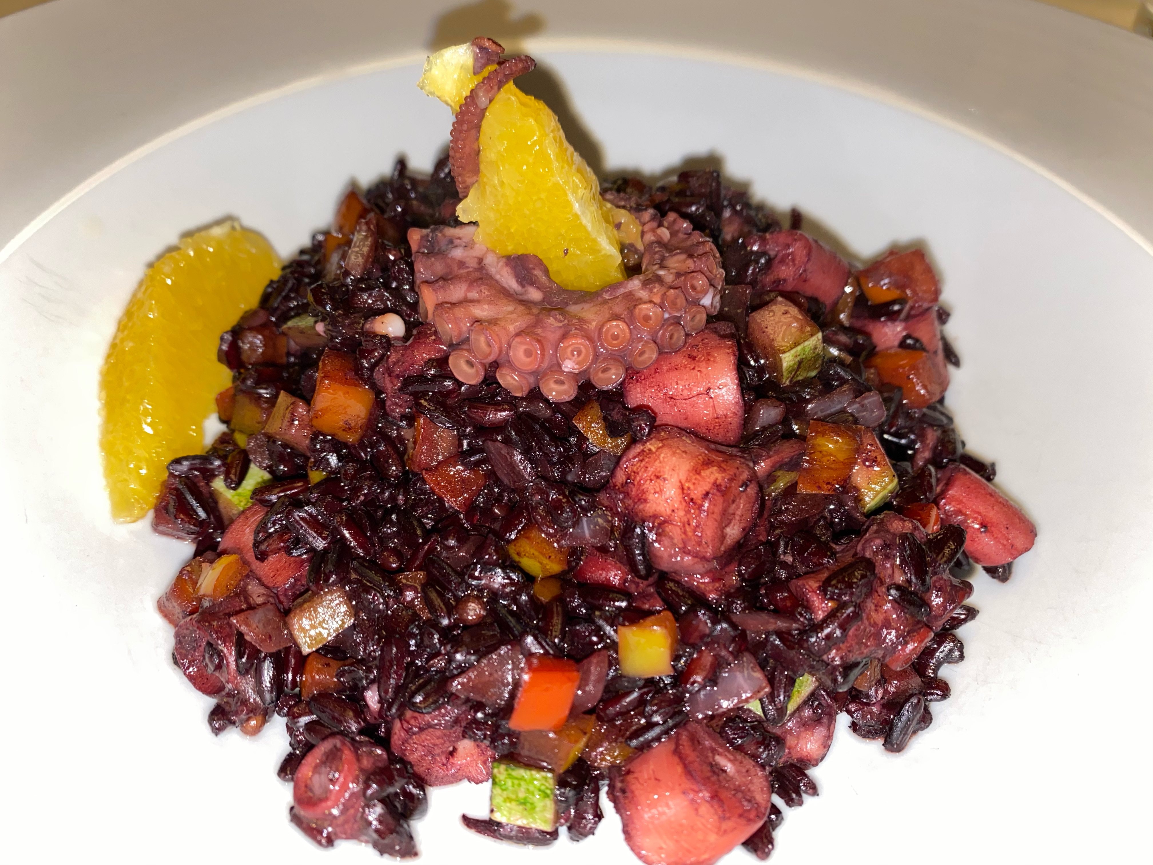 Acrescente os tentáculos de polvo cortados em pedaços pequenos, refogar por um minuto, drenar o arroz, retirando o excesso de água, incorporar ao refogado.