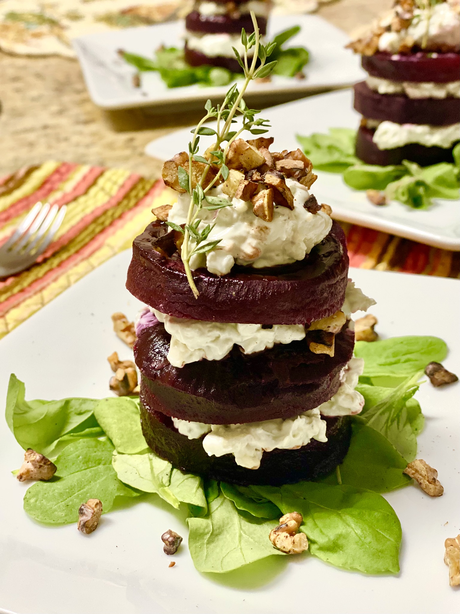 No prato, deite uma pequena cama de rúcula, tempere com balsâmico reduzido, coloque uma fatia de beterraba como base, faça uma camada de recheio de queijo roquefort por cima, acrescente nozes picadas. Repita com mais 2 fatias de beterraba. Finalize com ramo de tomilho.