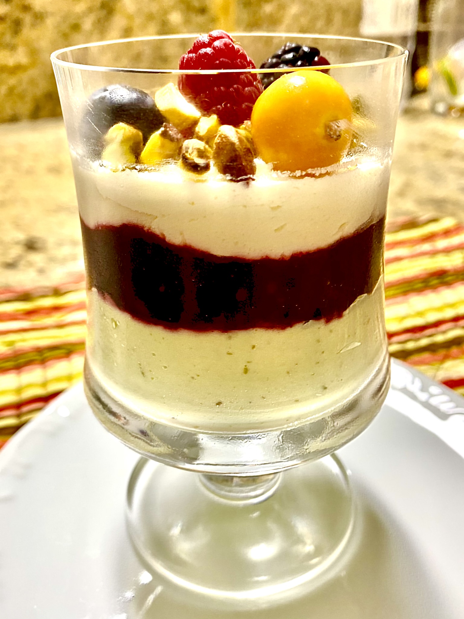 Usando uma taça ou um pequeno copo, faça uma camada do creme de pistache, a segunda camada com geléia de amoras e a terceira camada com mascarpone.