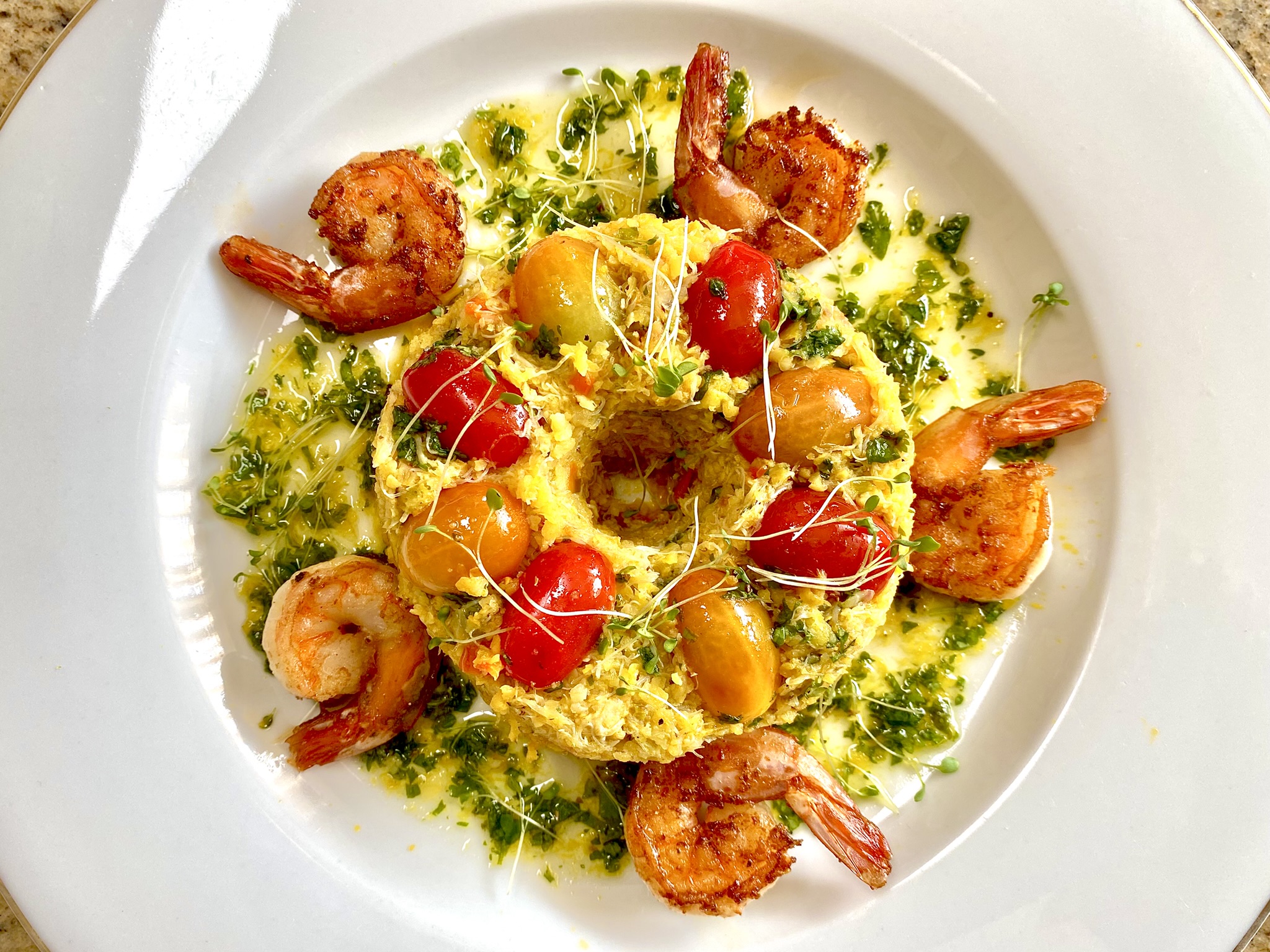 - Unte uma fôrma com furo no meio e coloque os tomatinhos, cortados no meio, com a parte da pele para baixo. Tempere com sal, pimenta, azeite, cheiro verde picado e as raspas de limão.
