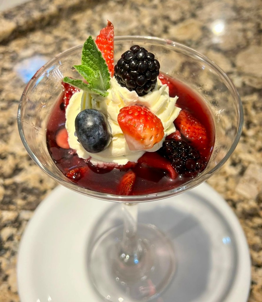 Montar as taças com camadas de frutas e de creme azedo finalizar com hortelã fresca.