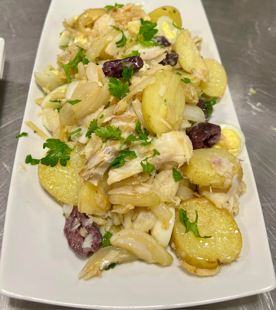 Cortar as cebolas em pétalas e refogar no azeite de oliva. Acrescentar o alho, o bacalhau em lascas e as batatas cozidas. Acertar o sal e finalizar com as azeitonas, ovos cozidos e salsa picada.