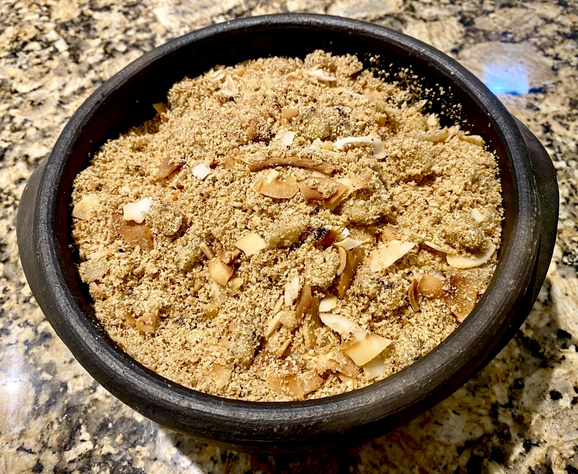 cúrcuma e refogar. Em seguida adicionar a farofa biju e tostar até dourar.