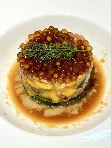 Servir em um aro com o pepino crocante na base, o atum com manga até encima e no topo finalizar com as “pérolas” de sagu e o molho emulsionado em volta.