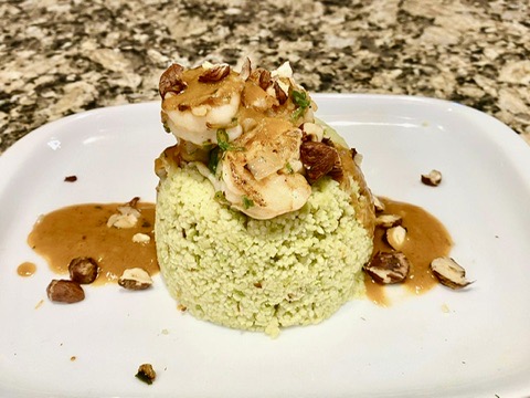 -Salteie os camarões, misture o creme verde ao couscous e acrescente a noz pecan, pimenta e sal. Finalize com o bisque por cima.