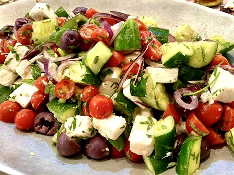 -Cortar os pepinos em cubos grandes, os tomates ao meio e picar o pimentão em cubinhos e cebola roxa em fatias. “Picar” o Queijo Feta.