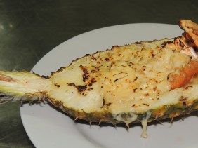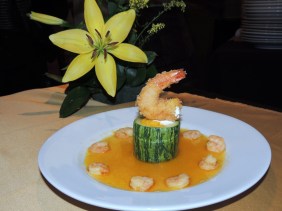 CAMARÃO COM ABOBRINHA RECHEADA COM PURÊ DE MORANGA