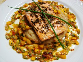 Filé de salmão às ervas com purê de banana